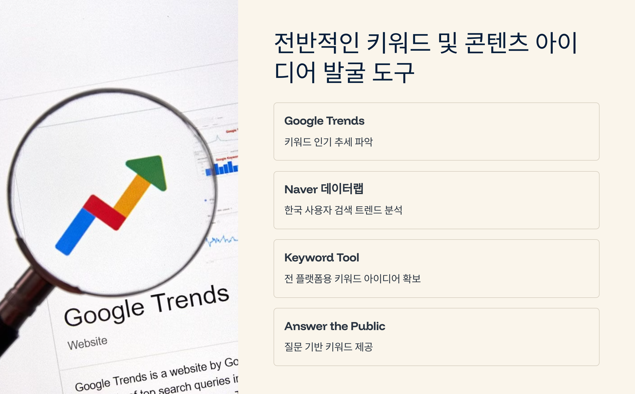 | 블로그/유튜브 | Google Trends | 인기 검색어 흐름 분석 |